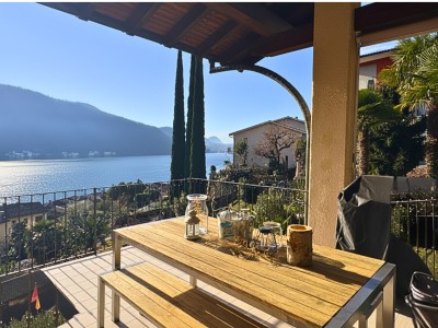 La zona giorno, ampia e luminosa, accoglie un soggiorno con cucina moderna e ben organizzata, perfetta per momenti conviviali e per chi ama gli ambienti funzionali e accoglienti. Dal soggiorno si accede al balcone, un piacevole spazio esterno che regala una suggestiva vista sul lago di Lugano e sulle montagne circostanti, ideale per rilassarsi o pranzare all’aperto.