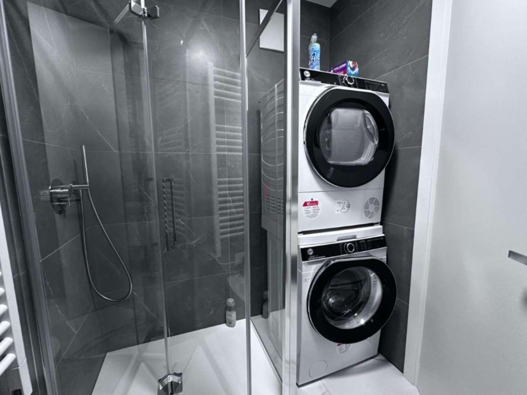 Il bagno, dal design contemporaneo e rifinito con materiali di qualità, è dotato di ampia doccia e di una pratica colonna lava-asciuga privata; rimane inoltre disponibile una lavanderia condominiale ad uso comune.